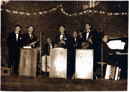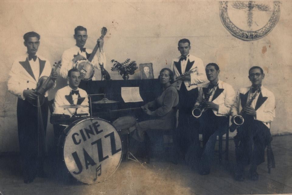 Foto de 1942. Legenda (esq-dir.): António Correia - violino, Francisco (Chico Alfaiate) - bateria, Desconhecido - banjo, Desconhecida - piano, Patrocínio - trompete, Irineu Amaral - saxofone e Chaves - saxofone.
