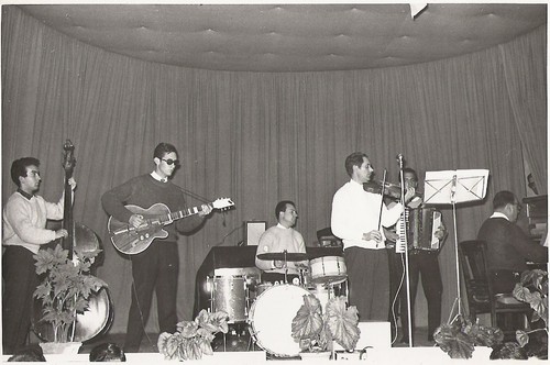 Actuação da Orquestra Cine Jazz, (+-1960), Festas dos Santos Populares no Académico de Viseu com (esq.dir): Carlinhos da Sé o vocalista, Patrocínio no trompete, Martins na bateria, Chaves no saxofone, Desconhecido no rabecão, António Correia no violino e Maestro Mário Costa ao piano.