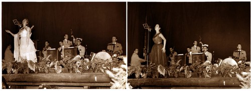Orquestra Cine Jazz no Avenida Teatro acompanhando a Maria de Fátima Bravo(esq) e Maria Amélia Canossa, anos 50's. A Orquestra, dirigida pelo Maestro Mário Costa, ao piano, com António Correia no violino, Patrício no trompete, Chaves ao saxofone, Manuel Pires ao rabecão e Martins na bateria.